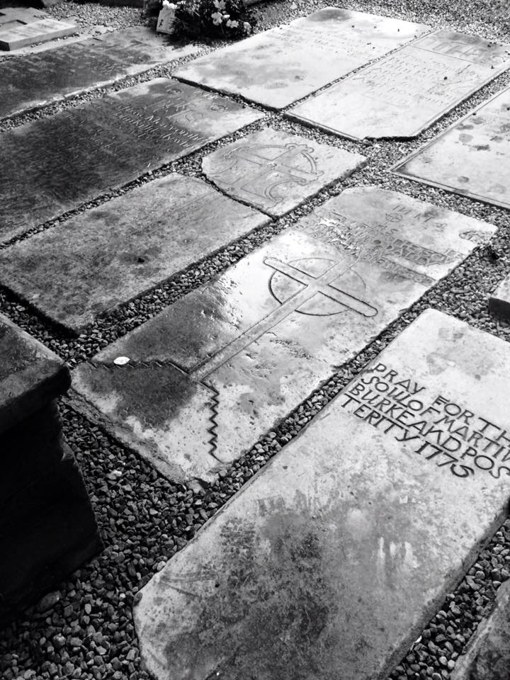 From there we proceeded to the ruins of an old church that was pillaged by Thomas Cromwell during the Dissolution of Monasteries. There we sidestepped over the gravestone floors, slick and glassy with rain (for the roof is gone). There were also skulls under the altar. I planted my knees in the gravel and pressed my cheek to the cold ground just to glimpse them.