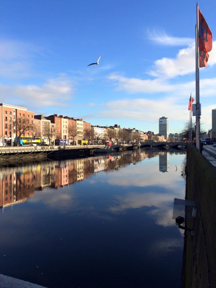 The next morning, I stumbled down from my top bunk (still recovering from the pizza overload), threw on some comfy shoes, and sauntered outside. The River Liffey, which cuts through the city center, is only a 5 minute walk from Abraham Hostel, which is quite convenient. Many hostels along the river also offer free walking tours for their guests. If your hostel does not offer this, you can sometimes pay to reserve spots on other hostels’ tours. We didn’t know this at the time, so we were left to wander alongside the winding river on our own. Which was no problem at all. We explored at our own pace, browsing shops and bars on our way to Ha’Penny Bridge, a walking bridge that connects the north and south sides of the river. Opened in the early 19th century, it acquired its name because of the toll to cross it: a half penny coin. Being such a gorgeous day, we snapped a multitude of photos. The sky was blue with wispy clouds, and the rows of brick buildings along the street impressed their crystal reflections upon the still blue waters.